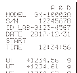 天びんやはかりの内部設定でGLP/GMP(inFo設定)をオンにすると次の例のように「見出し」を印字することができます。